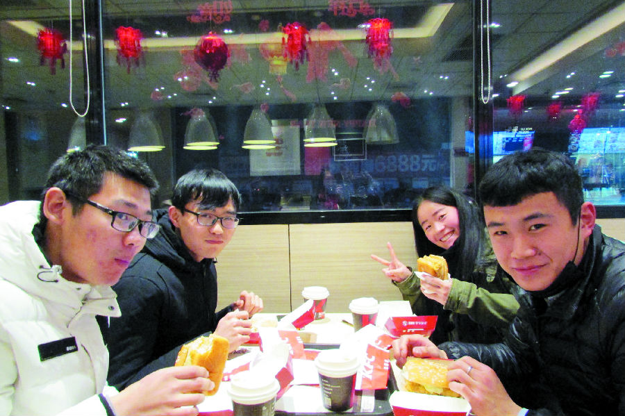 “圍爐聚炊歡呼處,百味消融小釜中”,三五好友,圍桌而坐,熱氣騰騰的火鍋,豐盛的食材,肉類、海鮮類、蔬菜類、豆制品類、菌菇類等一應(yīng)俱全,把盞共飲,吃得不亦樂乎。肯德基餐廳內(nèi),香噴噴的漢堡、色香味俱全的雞腿、雞翅、清涼的飲料、酥焦的薯?xiàng)l,年青朋友邊吃邊聊,吃得開心,玩得痛快,歡聲笑語不時(shí)響起,度過了一個(gè)有意義的節(jié)日。